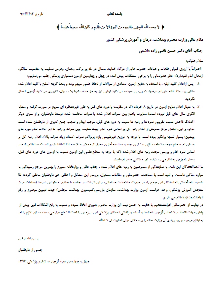 در نهایت از حضرتعالی خواهشمندیم با عنایت به حسن نیت آن وزارت محترم تدبیری اتخاذ نموده و نسبت به رفع اشکالات فوق پیش از پایان مهلت انتخاب رشته این آزمون که امید و آینده و زندگی نخبگان پزشکی این سرزمین را تحت الشعاع قرار می دهد، دستور لازم را امر به ابلاغ فرموده و روسپیدی آن وزارت خانه را بر همگان عیان نمایید، ان شاءالله.
