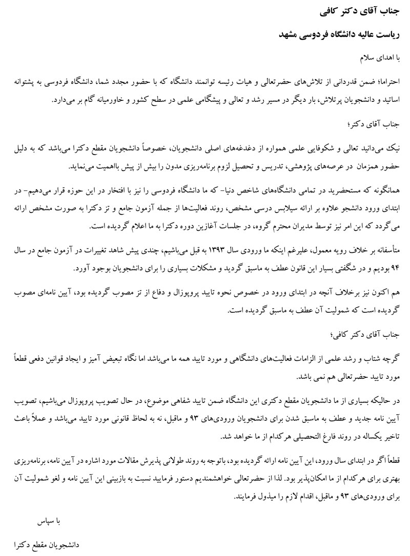 گرچه شتاب و رشد علمي از الزامات فعاليت هاي دانشگاهي و مورد تاييد همه ما مي باشد اما نگاه تبعيض آميز و ايجاد قوانين دفعي قطعاً مورد تاييد حضرتعالي هم نمي باشد در حاليكه بسياري از ما دانشجويان مقطع دكتري این دانشگاه ضمن تايید شفاهي موضوع، در حال تصويب پروپوزال مي باشيم، تصويب آيين نامه جديد و عطف به ماسبق شدن براي دانشجويان وروديهاي ٩٣ و ماقبل، نه به لحاظ قانوني مورد تاييد مي باشد و عملاً باعث تاخير يك ساله در روند فارغ التحصيلي هركدام از ما خواهد شد