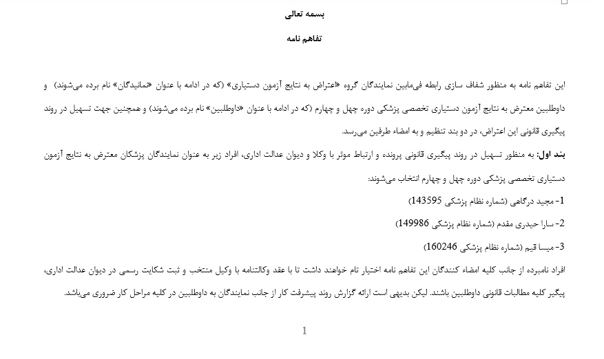 این تفاهم نامه به منظور شفاف سازی رابطه فیمابین نمایندگان گروه «اعتراض به نتایج آزمون دستیاری» (که در ادامه با عنوان «نمانیدگان» نام برده میشوند) و داوطلبین معترض به نتایج آزمون دستیاری تخصصی پزشکی دوره چهل و چهارم (که در ادامه با عنوان «داوطلبین» نام برده میشوند) و همچنین جهت تسهیل در روند پیگیری قانونی این اعتراض، در دو بند تنظیم و به امضاء طرفین میرسد.